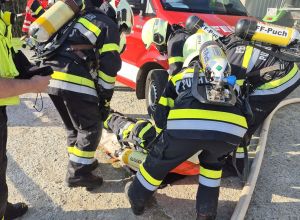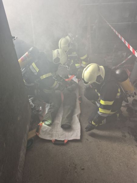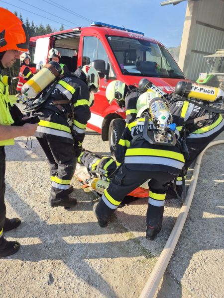 Durchführung eines Innenangriffs unter schwerem Atemschutz zur Menschenrettung eines ATS-Trägers der FF Preßguts sowie zur Rettung einer weiteren eingeklemmten Person unter einem Förderband. Die Befreiung erfolgte unter Einsatz von Rettungshebekissen.